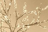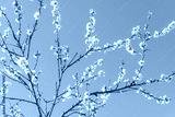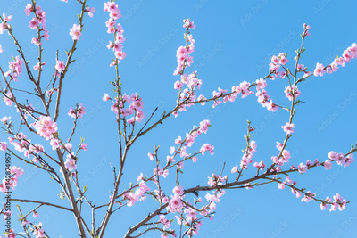 Pink peach flowers on twigs on blue sky background on spring time closeup. Nature photography