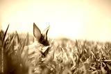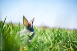Small grey rabbit in green grass closeup. Can be used like Easter background. Animal photography