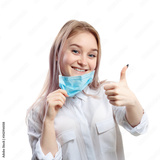 young blonde girl in a white blouse and a medical mask on a white background.