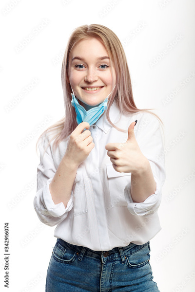 young blonde girl in a white blouse and a medical mask on a white background.