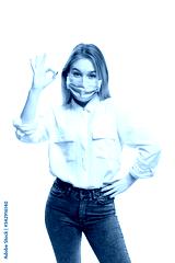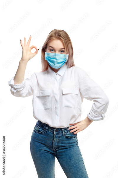 young blonde girl in a white blouse and a medical mask on a white background.