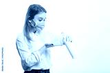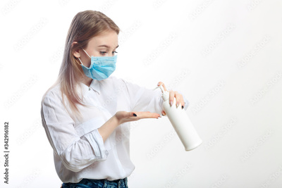 young blonde girl in a white blouse and a medical mask uses an antiseptic on a white background