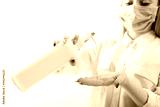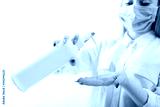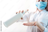 young blonde girl in a white blouse and a medical mask uses an antiseptic on a white background