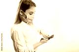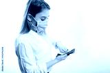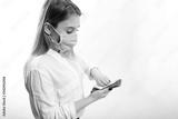 young girl in a white blouse and in a medical mask wipes a smartphone with an antiseptic napkin on a white background