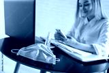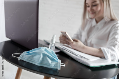 close-up of a blue medical mask on a background of a laptop and a girl who works at home.