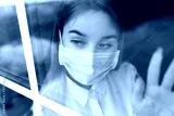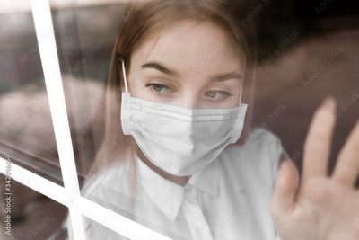 a young blonde girl in a white blouse and a medical mask sits outside the window and looks outside.