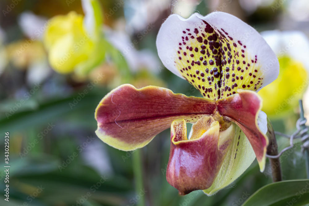 Orchid flower in orchid garden at winter or spring day for beauty and agriculture design. Paphiopedilum Orchidaceae. or Lady's Slipper