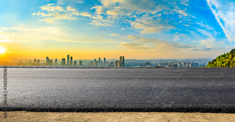 Empty asphalt road and Chongqing city skyline and buildings at sunset,China.