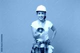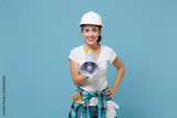Cheerful young woman in casual clothes, protective helmet hardhat hold megaphone isolated on pastel blue background studio. Instruments accessories for renovation apartment room. Repair home concept.