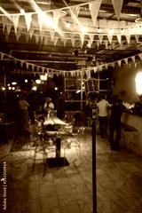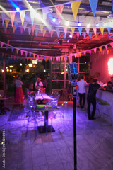 Vintage microphone on the stage of a night club. Beautiful multi-colored light