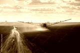 Big sprayer in the arable field with dirt road in early spring , view with evening sky sunset
