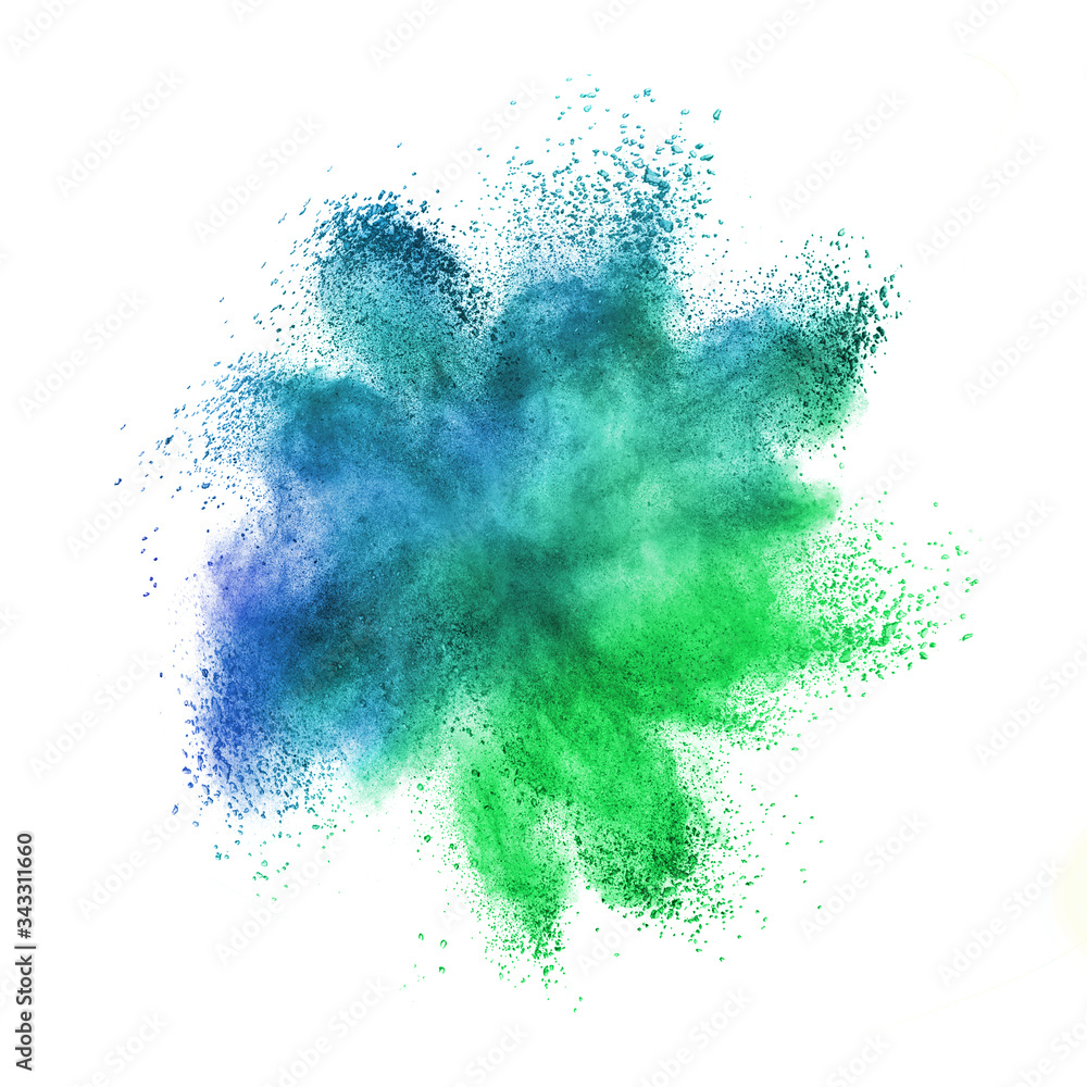 Chaotic explosion in blue-green colors on a white background.