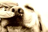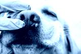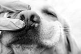 Dog allergic at a doctor’s appointment with a problem under the nose.Muzzle close-up. Open eczema.