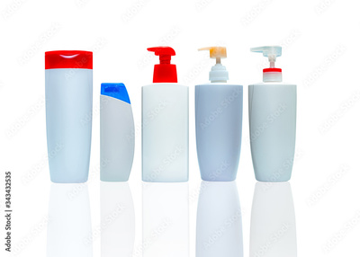 Shampoo, hair conditioner, and body lotion plastic bottle and dispenser pump. Skincare cosmetic bottle isolated on white background. Body soap and shower gel packaging. Liquid soap bottle. Body care.
