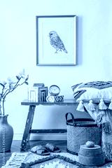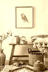 Stylish composition of living room interior with mock up frame, wooden bench, pillow, plaid, rattan basket, flower, decortaion and elegant personal accessories in modern home decor.