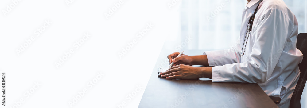 Close up of doctor sitting hands at the table and writing a prescription, Healthcare and medical. proportion of the banner for ads.