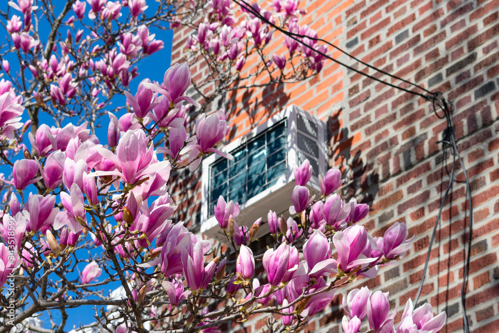 Pink Magnolia Flowers during Spring next to a Brick Residential Building with a Window Air Conditioner in Astoria Queens New York