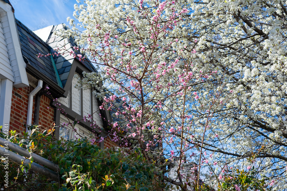 Pink and White Magnolia Trees during Spring next to Beautiful Homes in Astoria Queens New York