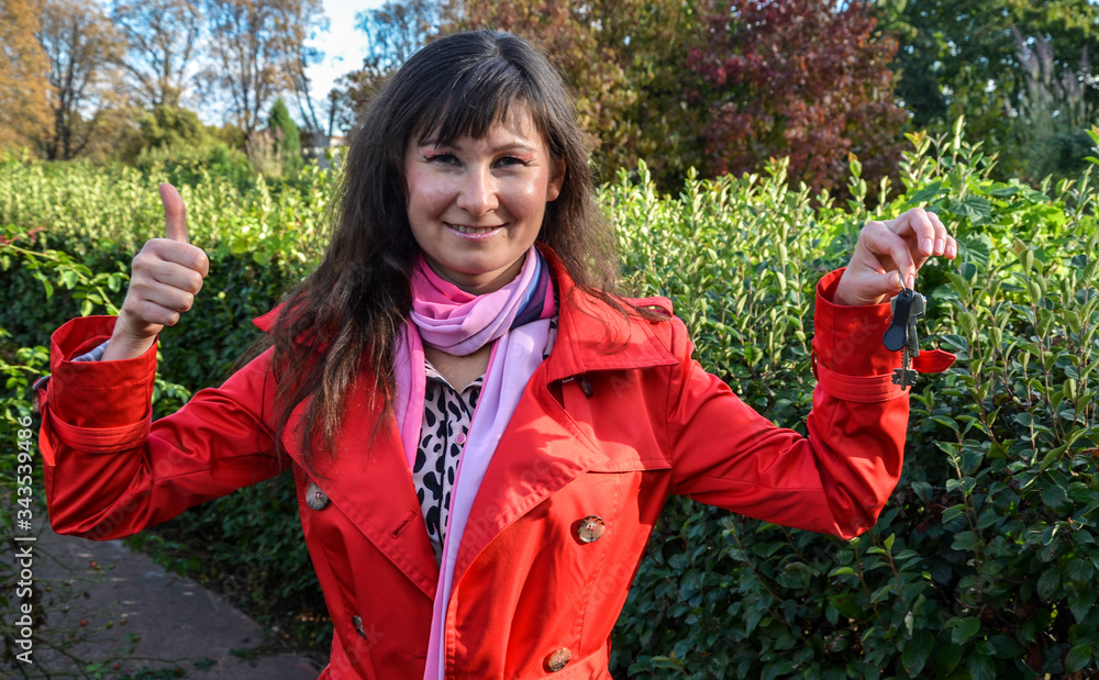 Young happy woman with the keys in his hand and thumb up. Concept of buying or rental car or a apartment.