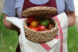 Tomates ancienne, producteur tenant des tomates dans une corbeille