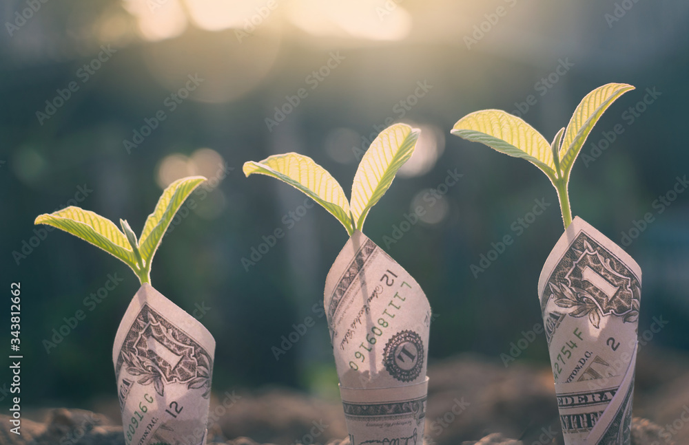 Close-up dollar with green plant growing on top for business.They are on sun light on soil.saving,growth,investment,financial,photo business and economic concept.