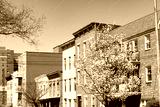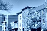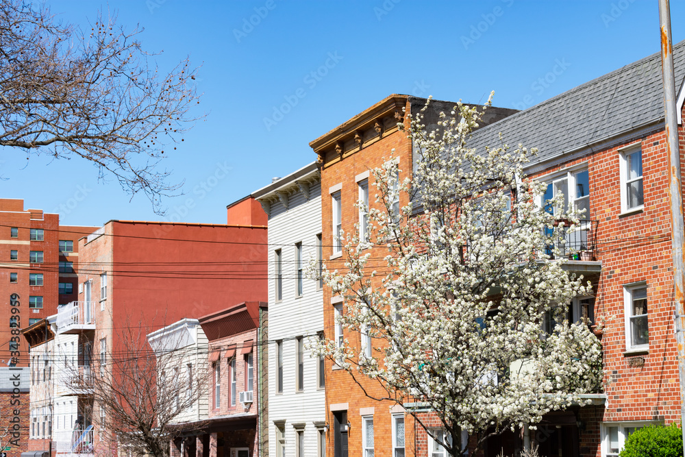 A Row of Colorful Residential Buildings and Homes in Astoria Queens of New York City with a White Flowering Tree during Spring
