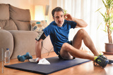 Man resting after doing sports listening to music at home