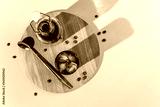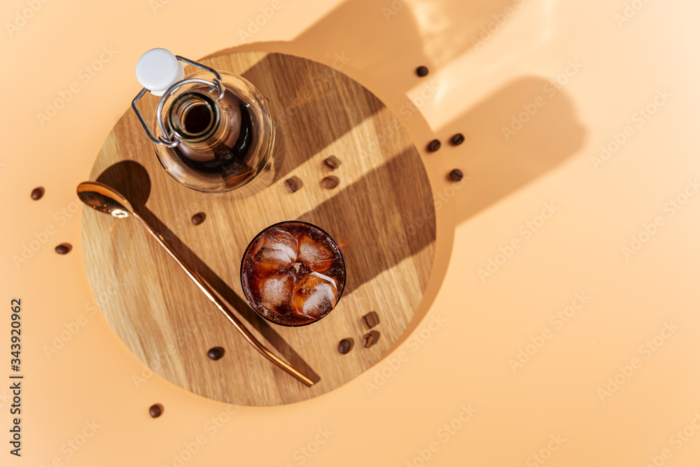 Cold brew coffee with ice cubes in glass and cofee beans on wooden tray,beige background,hard light,top view