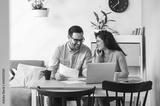 Smiling couple managing finances, reviewing their bank accounts using laptop computer and calculator at modern kitchen stock photo