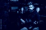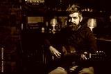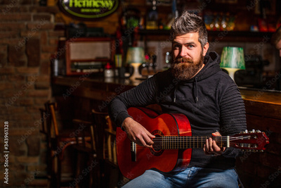 Bearded man playing guitar, holding an acoustic guitar in his hands. Play the guitar. Beard hipster man sitting in a pub. Music concept. Bearded guitarist plays