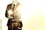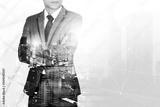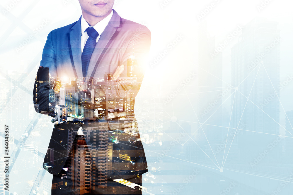 Double exposure image of businessman with city view.The boss have vision and leadership for strategy in business to success in market mechanism concept.