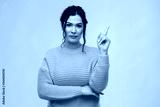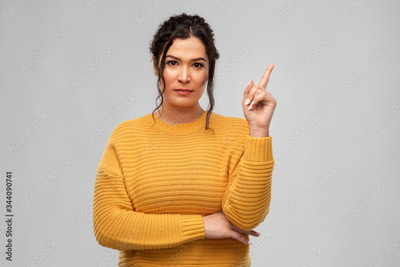 people concept - serious young woman with pierced nose pointing finger up over grey background