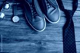 Top view of mens brown casual shoes, tie, wristwatch and glasses on wooden background