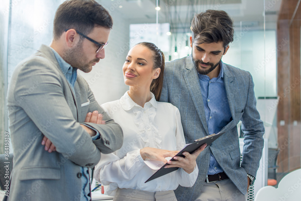 Beautiful businesswoman discussing document with male colleagues in an office. Three business partners discussing paperwork in the office