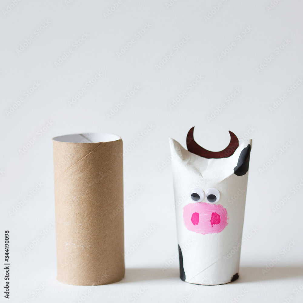 kid crafts bull from recycled materials. children's art. child create cow. handcraft toy
