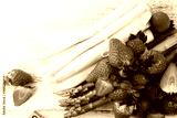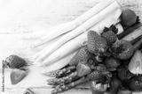 White and green asparagus with strawberries on rustic background with Spargelzeit wooden letter.