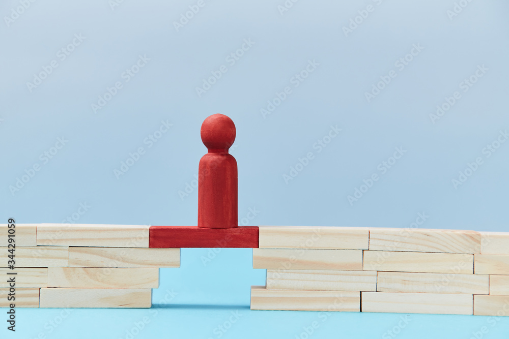 Business risk. Danger and chance. Mockup style for design. Copy space. Red wooden figures stands on plank of bridge gap