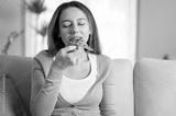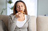 Beautiful young girl eating a slice of pizza at home
