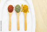 Ingredient Herbal powder Ginger ,Green beans, in wooden spoons isolated