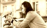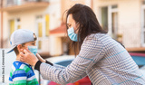 Mother, child wear facemask during coronavirus, flu outbreak. Mom puts a medical mask on her son. Child and mom in medical mask on a walk. Mother puts on her son sterile medical mask