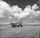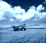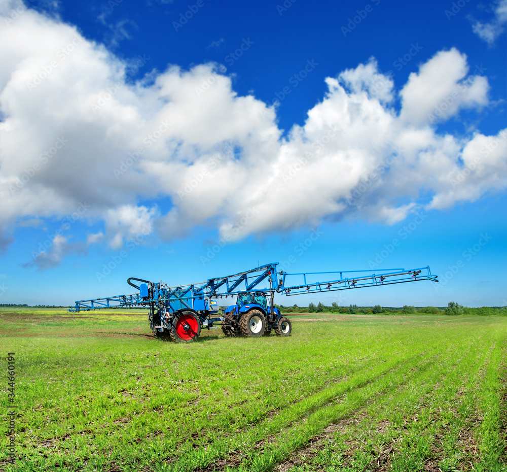 new blue tractor in field work with trailed sprayer, winter crop fertilizers, spring crop fertilizers