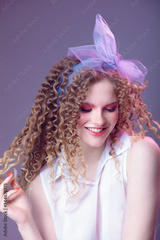 Portrait of a curly cheerful girl with professional make-up and retouching in the studio