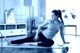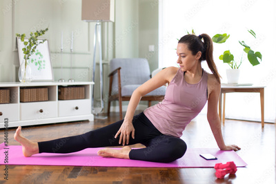 Beautiful sporty woman stretching exercise in her living room