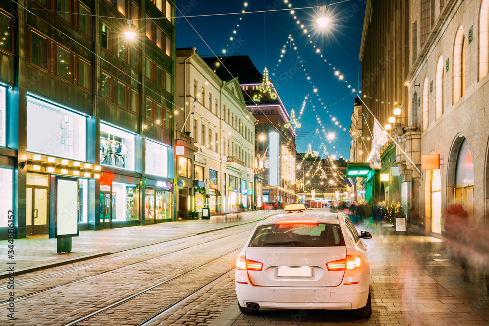 Helsinki, Finland. Taxi Car Parking On Aleksanterinkatu Street. Xmas Christmas Lights Decorations And Festive Illumination. Winter Christmas Xmas Holiday Season