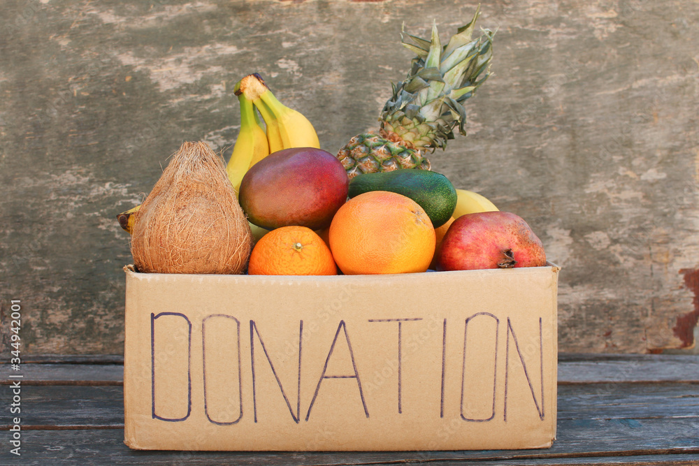 Donation box with food on old wooden background.