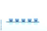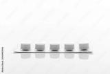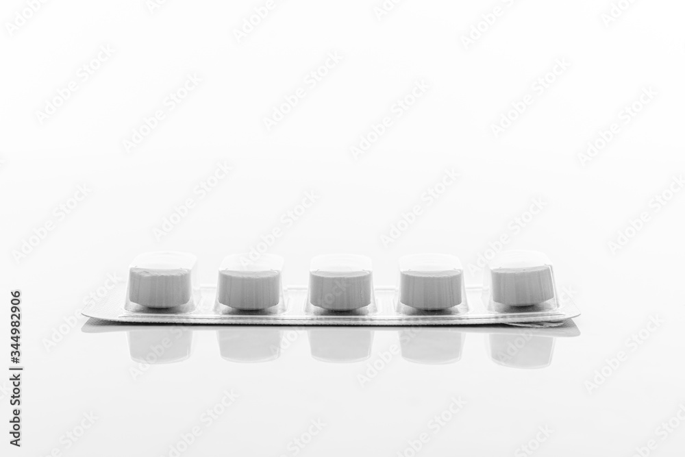 Pills in white foil capsule tablet packaging lay flat and isolated on white background