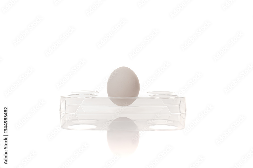 Single chicken egg in plastic holder isolated on white background