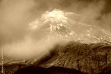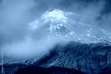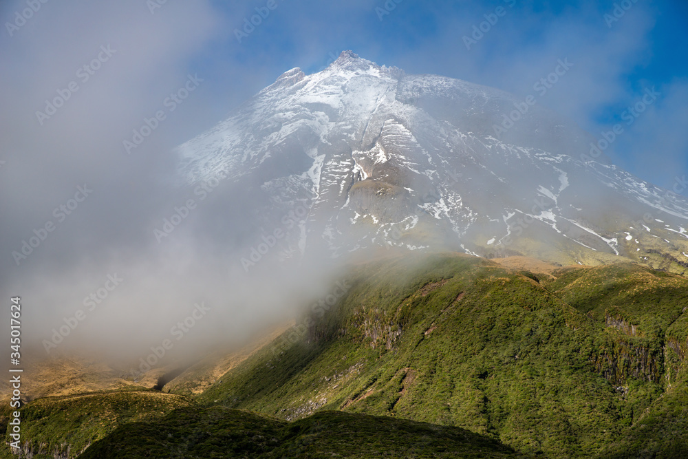 View of the summit peak of Mt.Taranaki covered with winter fog in Egmont national park, New Zealand. Mt.Taranaki (2518 metres) summit of this dormant volcano offers truly amazing views.