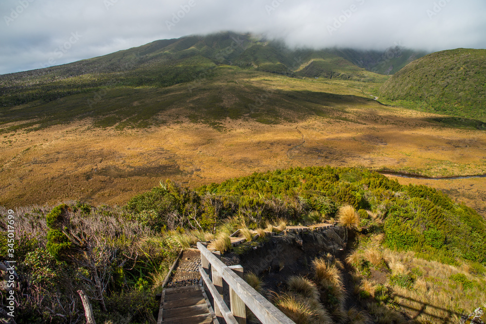 The down stairs to Ahukawakawa swamp on Pouakai Crossing tramping route in Taranaki region of western New Zealand. Egmont National Park is a dream destination for enthusiastic hikers.