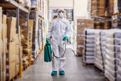 Man in protective suit and mask disinfecting warehouse full of food products from corona virus / covid-19.